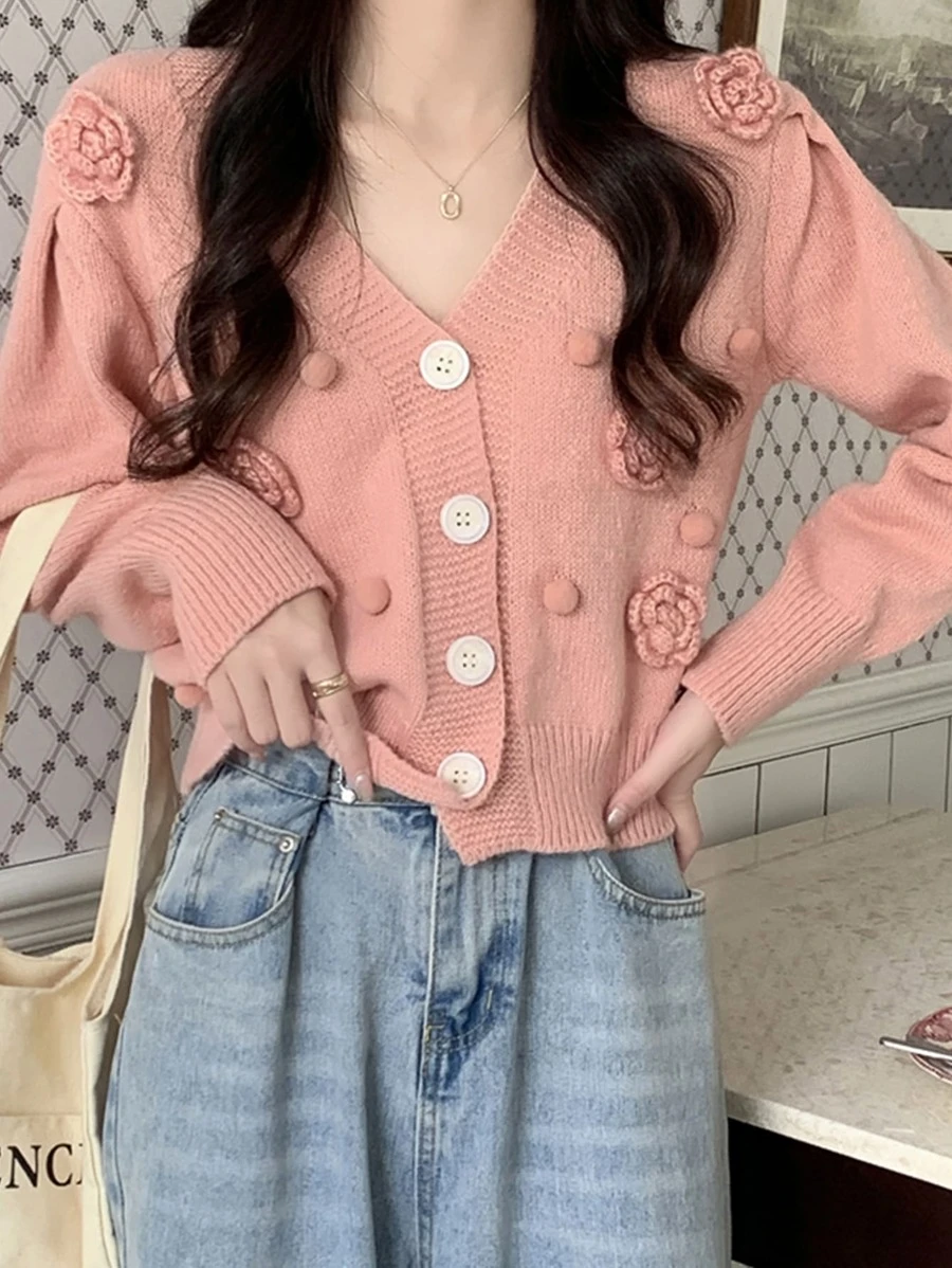 เสื้อคาร์ดิแกน ครอป สีพื้น โครเชต์ ดอกไม้ ปอมปอม i-71