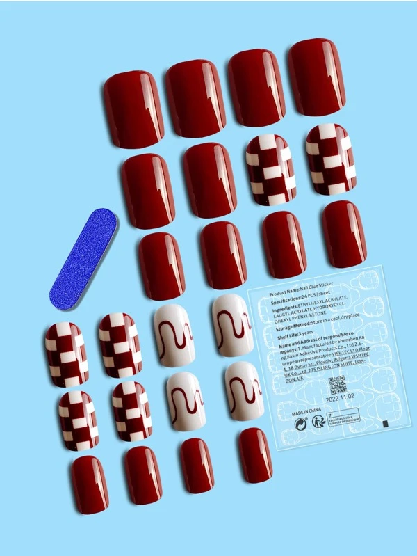 เล็บปลอม สั้น สี่เหลี่ยม กระดานหมากรุก & เทปกาว 1 แผ่น & ตะไบเล็บ 1 ชิ้น 24 ชิ้น c-67