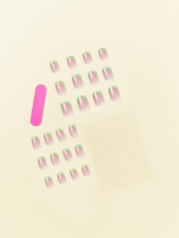 เล็บปลอม สั้น สี่เหลี่ยม สไตล์ ฝรั่งเศส 24 ชิ้น & เทปกาว 1 แผ่น & ตะไบเล็บ 1 ชิ้น c-30