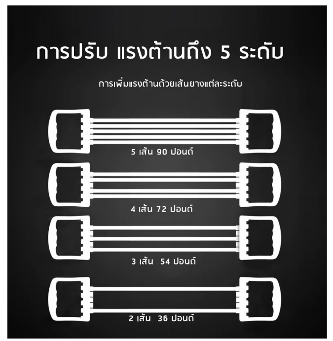 -ปรับเพิ่ม/ลดแรงต้านได้ โดยเพิ่ม/ลดจำนวนยางยืดตั้งแต่ 1 เส้นถึง 5 เส้น