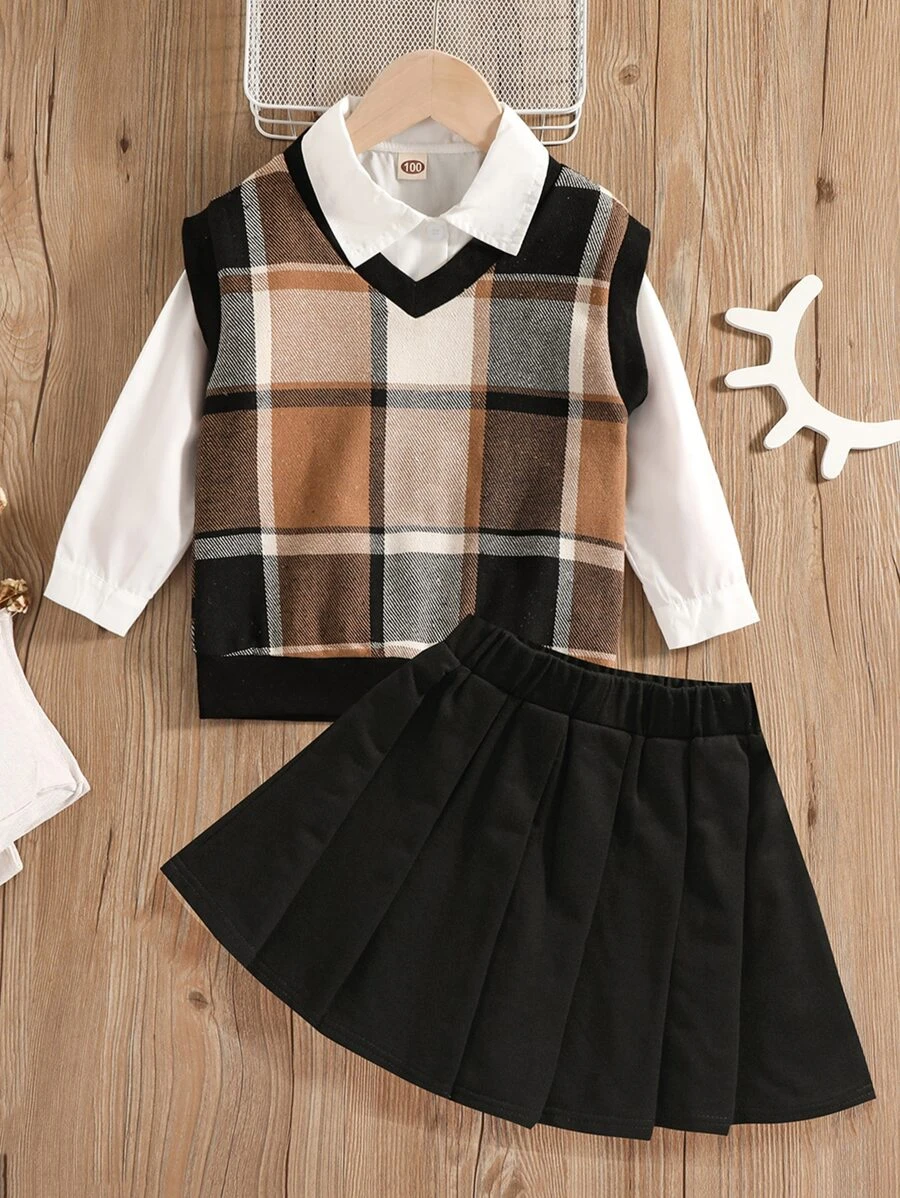 เด็กผู้หญิงวัยหัดเดิน 1 ชิ้น ลายสก็อต เสื้อคอวี เสื้อกล้าม & 1 ชิ้น เสื้อผู้หญิง a-44