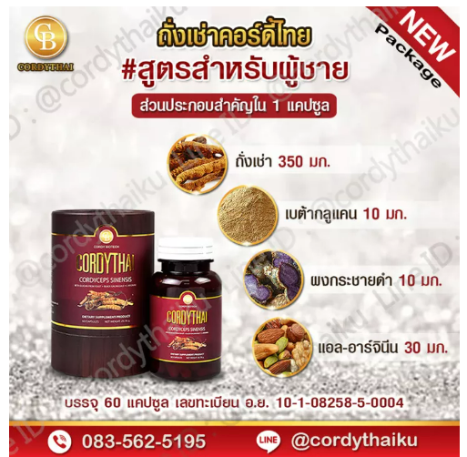 Product details of ส่งฟรี⚡ Cordythai ถั่งเช่าคอดี้ไทย สูตรใหม่ บรรจุ 60 เเคปซูล (โปร3แถม1) เลือกสูตรชาย-หญิงได้ 4 กระปุก ฟรี Power Bank E12 และ กระปุกตัดยา3in1