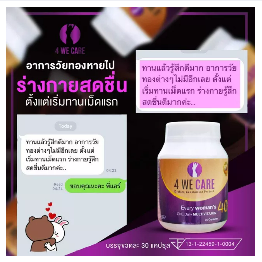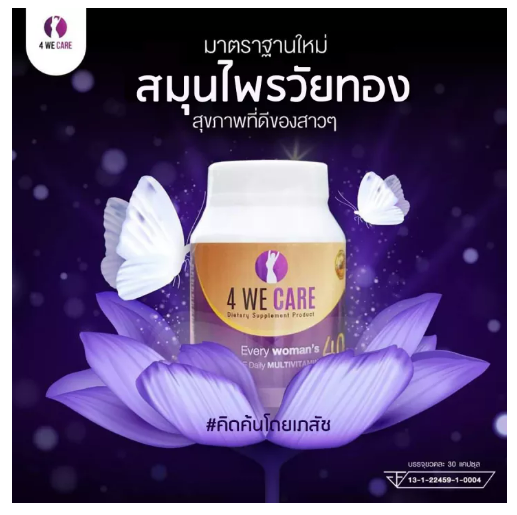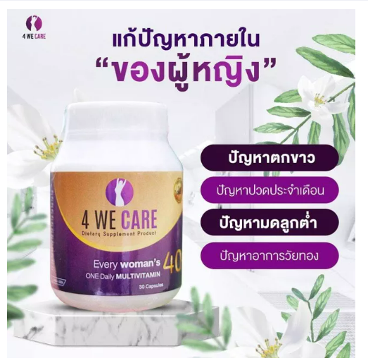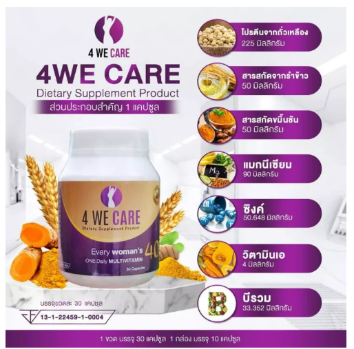 อาหารเสริมวัยทองสำหรับผู้หญิงอายุ 35 ปีขึ้นไป จำหน่ายมาแล้วกว่า 6 ปี ยืนยันโดยผู้ใช้จริงหลายหมื่นคน* บริษัทมีเภสัชกรและผู้เชี่ยวชาญให้คำแนะนำเพิ่มเติม และติดตามผลการทานอาการธรรมดา ที่ผู้หญิงเกือบทุกคนจะมี เมื่ออายุ 35 ปีขึ้นไป 1. นอนหลับยาก ตื่นกลางดึก แล้วนอนต่อไม่ได้ 2. ผิวหน้ามีฝ้า ริ้วรอย ไม่สดใส 3. ชาไปหมด ปวดเมื่อย 4. ปวดหัวบ่อย ไมเกรนขึ้น 5. ความเป็นหญิงน้อยลง เจ็บและแห้ง เจ็บแปล๊บๆที่มดลูก 6. เวียนศรีษะ ความดันต่ำ เลือดลมไม่ดี 7. หงุดหงิดง่าย จนใครๆ เรียกมนุษย์ป้า ทั้งที่จริงไม่ได้ตั้งใจหงุดหงิดเลย 8. ช่องคลอดแห้ง ผิวแพ้ง่าย คัน เกา 9. ผมร่วง เล็บหักง่าย 10. ปัสสาวะบ่อย กลั้นไม่ค่อยได้ 11. ช่องคลอดแห้ง ตกขาวอาการธรรมดาเหล่านี้ ดีขึ้นได้ เมื่อทาน 4 WE CARE.เหมาะสำหรับผู้มีปัญหาต่อไปนี้- มีปัญหาฮอร์โมนไม่สมดุล หรือเข้าสู่วัยทอง - ทำงานภายใต้สภาวะเครียด กดดัน พักผ่อนน้อย- ใช้สายตามาก หรือทำงานหน้าคอมพิวเตอร์เป็นประจำ มีปัญหาเคืองตา ตาแห้ง- ระบบภายในมีปัญหา มีกิจกรรมบนเตียงแสบขัด- พักฟื้นหลังการผ่าตัด คลอดบุตร หรือฟื้นฟูร่างกายหลังเจ็บป่วย- มีปัญหาในการนอนหลับ หลับยาก หลับไม่สนิท และอ่อนเพลียในตอนเช้า- ต้องการดูแลร่างกายเพื่อเพิ่มโอกาสในการมีบุตร- มีปัญหาภูมิแพ้- ต้องการดูแลสุขภาพองค์รวม ชะลอวัย บำรุงผิวพรรณให้เปล่งปลั่งสดใส