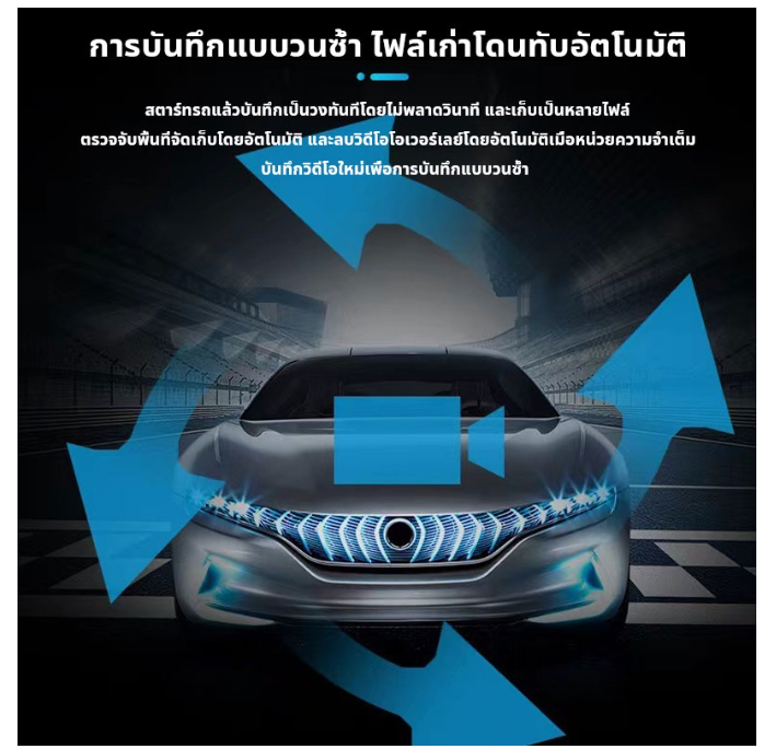 - Loop Recording บันทึกวีดีโอแบบหมุนวน เมื่อพื้นที่จัดเก็บเต็ม กล้องจะบันทึกไฟล์วีดีโอใหม่ ทับไฟล์เดิมไฟล์แรกสุด ทำให้บันทึกได้ยาวนาน ไม่ต้องกลัวว่า พื้นที่จัดเก็บจะเต็ม