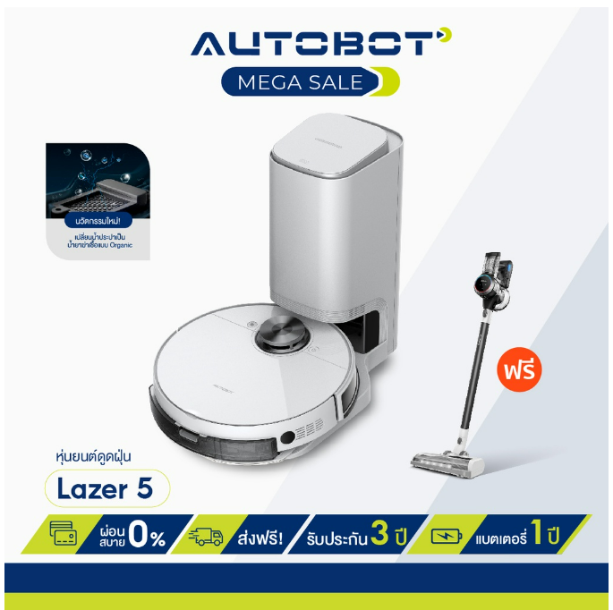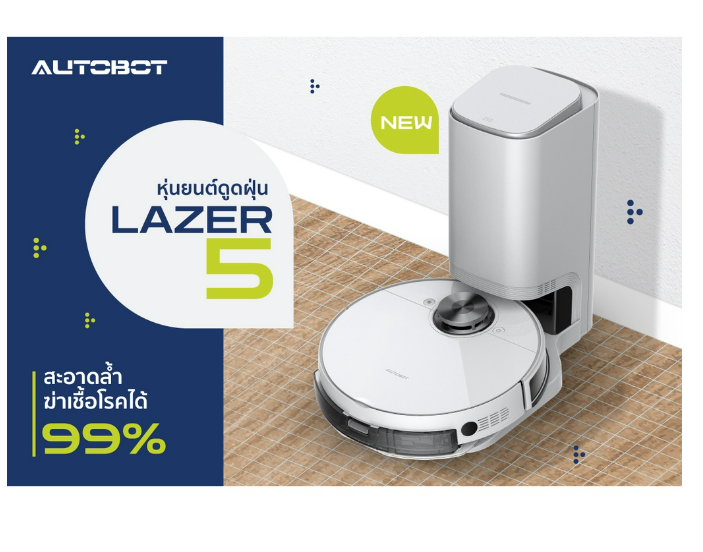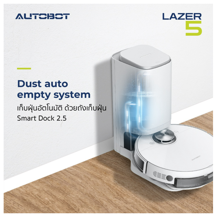 (H-005) AUTOBOT LAZER 5 หุ่นยนต์ดูดฝุ่น ถูพื้นระบบสั่น ขจัดคราบและผลิตน้ำ OH- ยับยั้งเชื้อโรค พร้อม Smart dock แถมฟรีเครื่องดูด