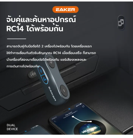 ข้อมูลเฉพาะของ EAKER FM Car Kit Bluetooth Receiver ตัวรับสัญญาณบลูทูธ บลูทูธติดรถยนต์ คอมผ่านช่องAUX/TF Card ฟังเพลงจากมือถือผ่านระบบไร้สาย ระบบเสียงสเตอริโอ รุ่น RC14