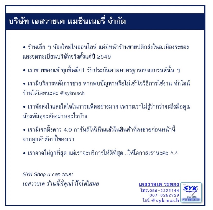 ที่ SYK เรามุ่งมั่นส่งมอบสินค้าที่มีคุณภาพ ตรงตามความต้องการใช้งานของลูกค้า หากอ่านสเป็คแล้วไม่เข้าใจ ทักแชทสอบถามได้เลยนะคะ
