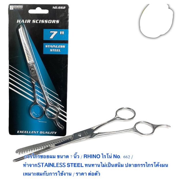กรรไกรซอยผม ขนาด 7 นิ้ว / RHINO ไรโน่ No. 662 / ทำจากSTAINLESS STEEL ทนทานไม่เป็นสนิม ปลายกรรไกรโค้งมนเหมาะสมกับการใช้งาน / ราคาถูก ราคาส่ง / ราคา ต่อตัว