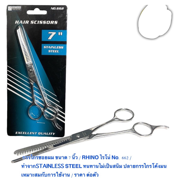 กรรไกรซอยผม ขนาด 7 นิ้ว / RHINO ไรโน่ No. 662 / ทำจากSTAINLESS STEEL ทนทานไม่เป็นสนิม ปลายกรรไกรโค้งมนเหมาะสมกับการใช้งาน / ราคาถูก ราคาส่ง / ราคา ต่อตัว