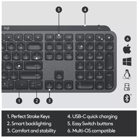 ข้อมูลเฉพาะของ Logitech MX Keys Advanced Wireless Keyboard with Bluetooth TH Key (คีย์บอร์ดไร้สายบลูทูธ พร้อมไฟ backlight คีย์แคปไทยอังกฤษ)