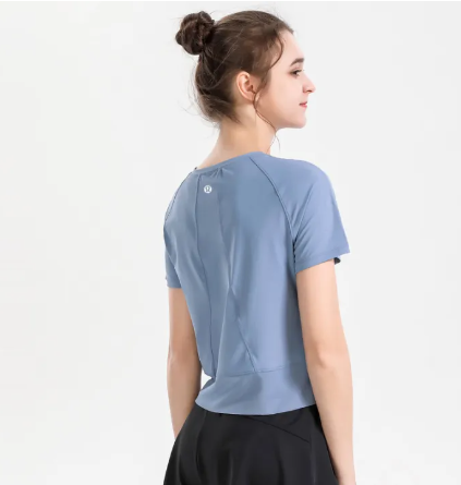 ข้อมูลเฉพาะของ Lulu โยคะกีฬาออกกำลังกายวิ่งบนแขนสั้นของผู้หญิงยืดหยุ่นหลวมระบายอากาศตาข่ายเสื้อยืดแห้งเร็ว