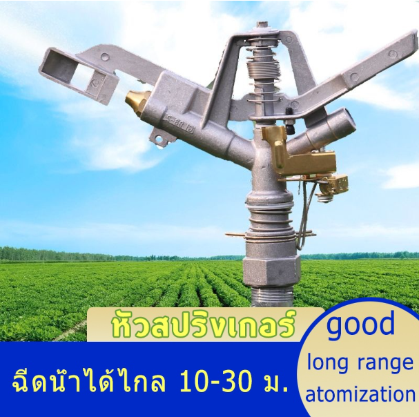-หัวสปริงเกอร์ แบบตีน้ำฉีดน้ำระยะไกล -ฉีดน้ำได้ไกล 10-30 ม. -อัตราการกินน้ำ 3000-6000 ลิตร/ชม. -แรงดัน 250-450kpa (2.5 - 4.5 Bar) -ปรับมุมหมุนซ้ายขวาได้ 360°ปรับให้หมุนรอบตัวได้